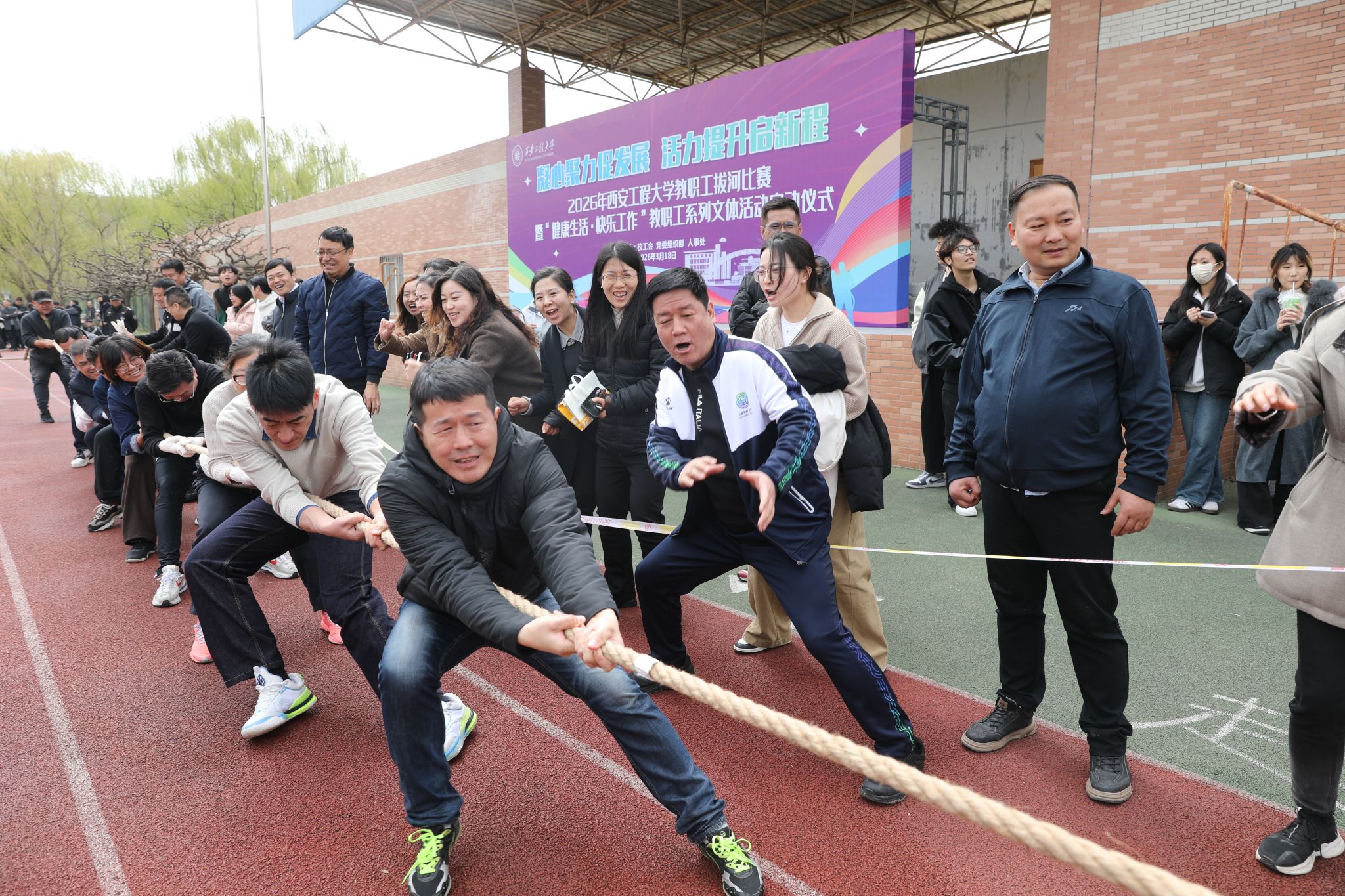 3月18日,由校工会、党委组织部、人事处联合主办的2026年教职工拔河比赛暨“健康生活,快乐工作”教职工系列文体活动启动仪式在临潼校区骊霞体育场举行。校领导张志昌、殷永建、戴鸿、夏蔡娟、杨建、张洛红出席活动。各职能处室、学院党政负责人、各分工会主席及19支队伍、近300名教职工参加了比赛。校党委书记张志昌宣布比赛正式,希望大家强健体魄、振奋精神,健康生活、快乐工作。本次拔河比赛主题为“凝心聚力促发展 活力提...