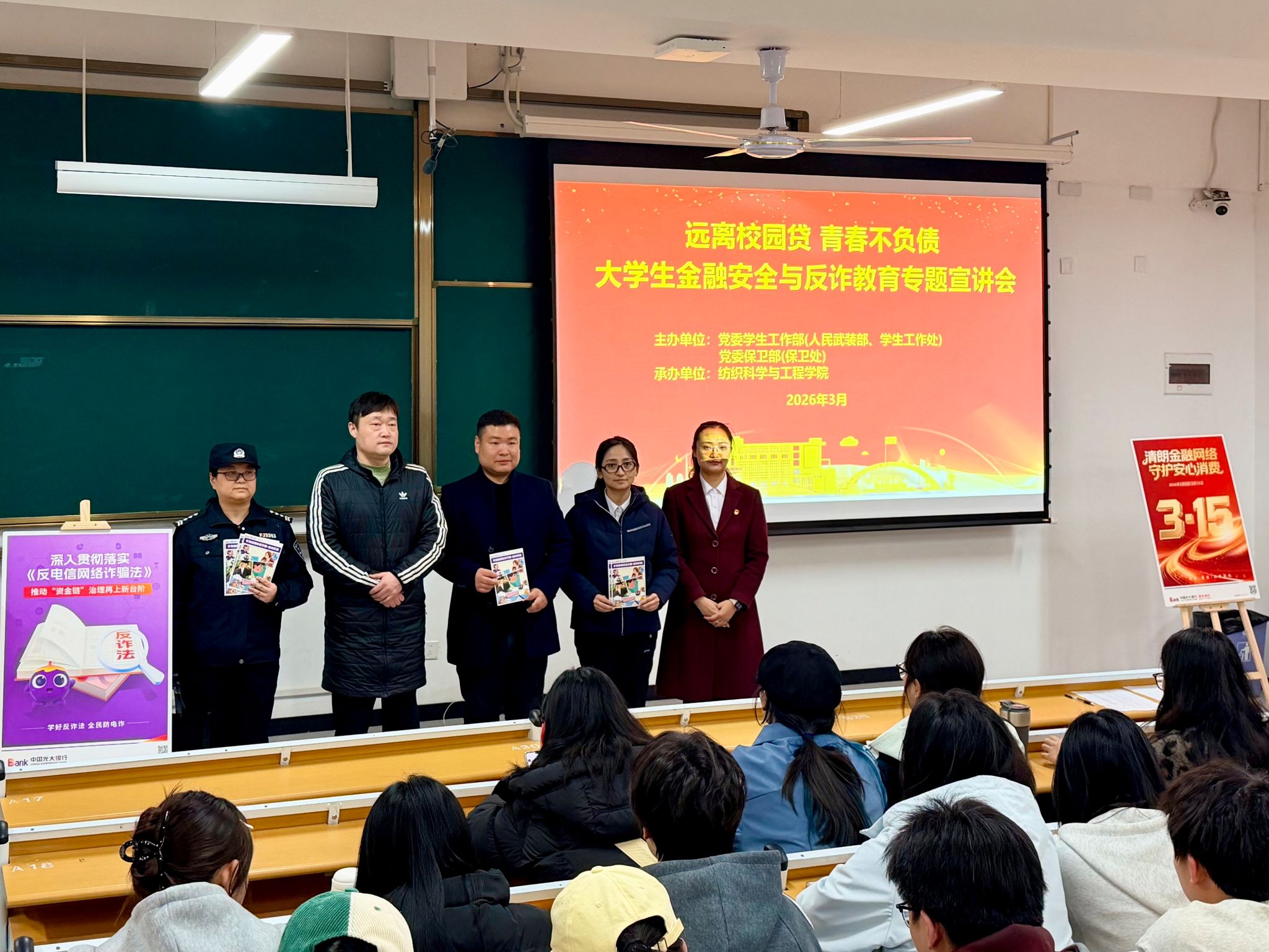 3月13日,best365官网在金花校区举办“远离校园贷 青春不负债”金融安全与反诈教育宣讲会。活动由党委保卫部、学生工作部(处)主办,纺织科学与工程学院承办,特邀中国光大银行西安兴庆路支行金融专家赵潇潇主讲,光大银行兴庆路支行负责人、驻校民警及金花校区相关学院100余名师生参加了活动。