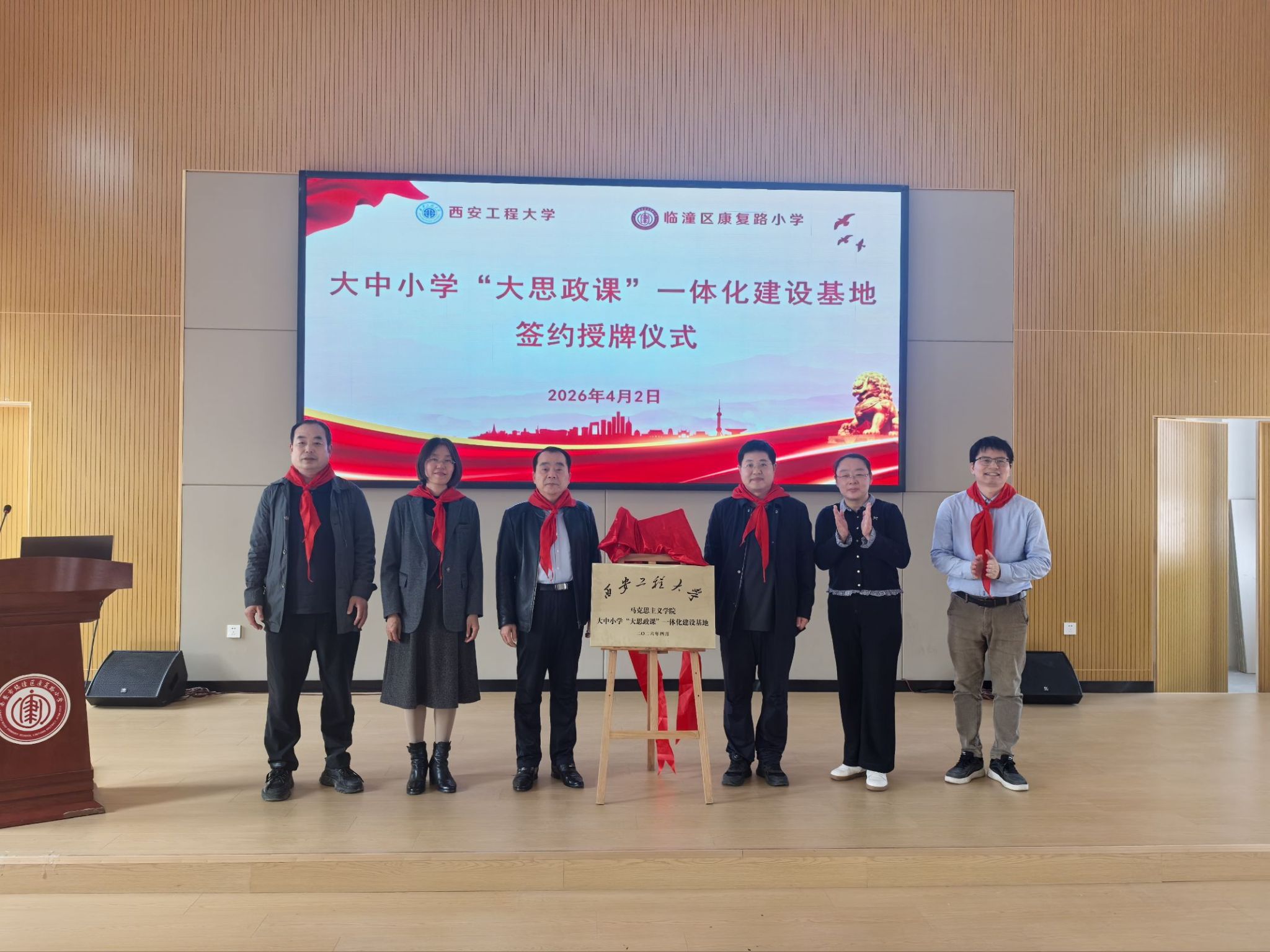4月2日,马克思主义学院与临潼康复路小学共建“大中小学‘大思政课’一体化建设基地”签约授牌仪式举行。临潼区教育局党委委员赵小县、教研室副主任王江河,康复路小学校长宋剑秋,best365官网马克思主义学院副院长郭松,康复路小学约200名师生参加活动。仪式会议由马克思主义学院党委副书记傅博娜主持。