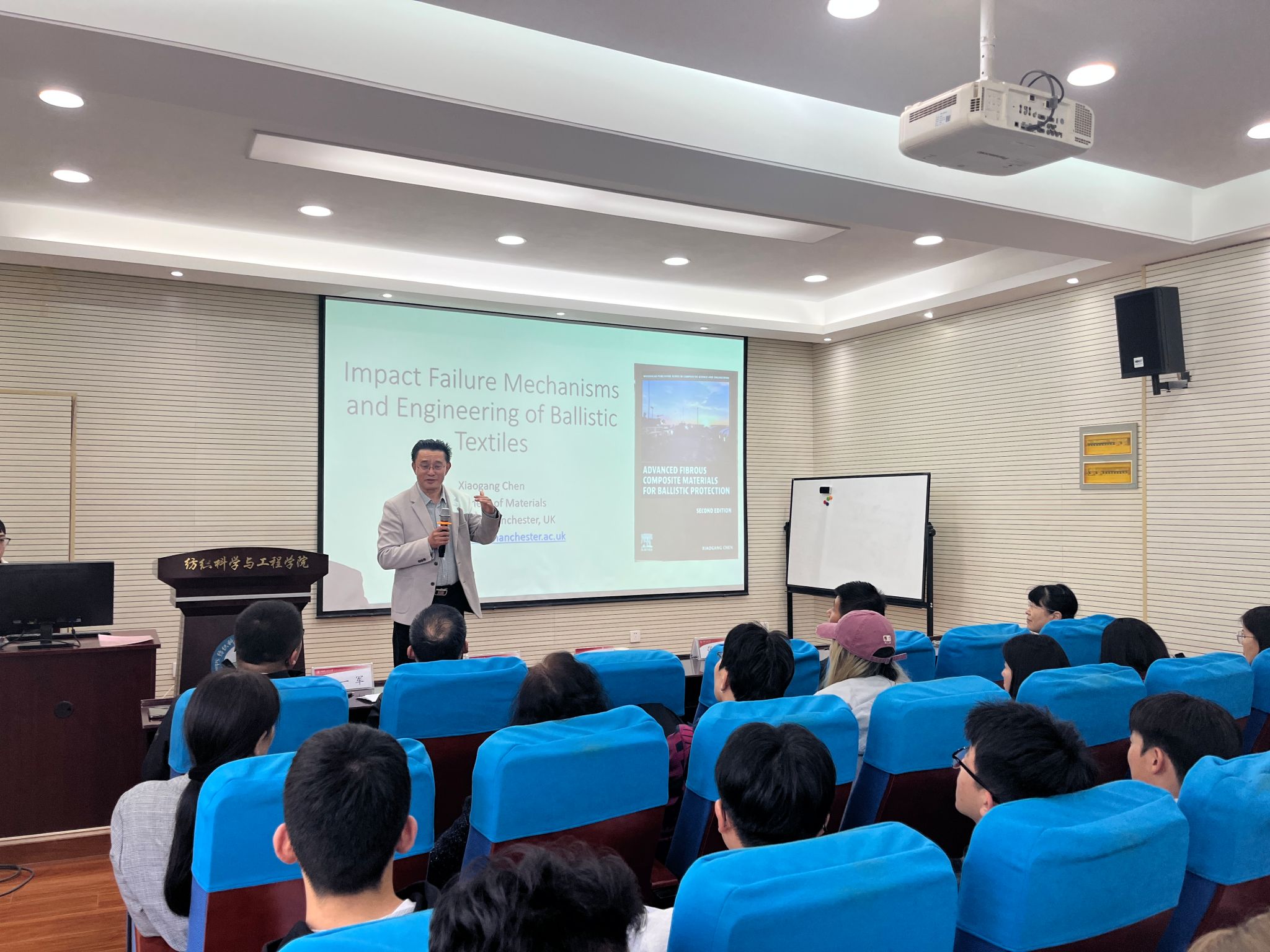 讲座中,陈晓钢教授以“抗高速冲击纺织材料的失效机理以及工程设计问题”为主题,结合防弹衣的工作原理与功能实例,深入浅出地揭示了防弹衣的失效机理,从多个维度探讨了防弹纺织材料组合的设计方法。他结合自身研究团队实践经验,提出实现轻质高效防弹材料的三个核心方向——界面摩擦性能调节、准各向同性防弹靶片设计、防弹靶片杂化设计,同时围绕剪切增稠液在抗冲击材料中的应用及防弹头盔的设计要点展开详细讲解,内容兼具学术深度与实践指导性,为在场师生带来了一场前沿的学术盛宴。