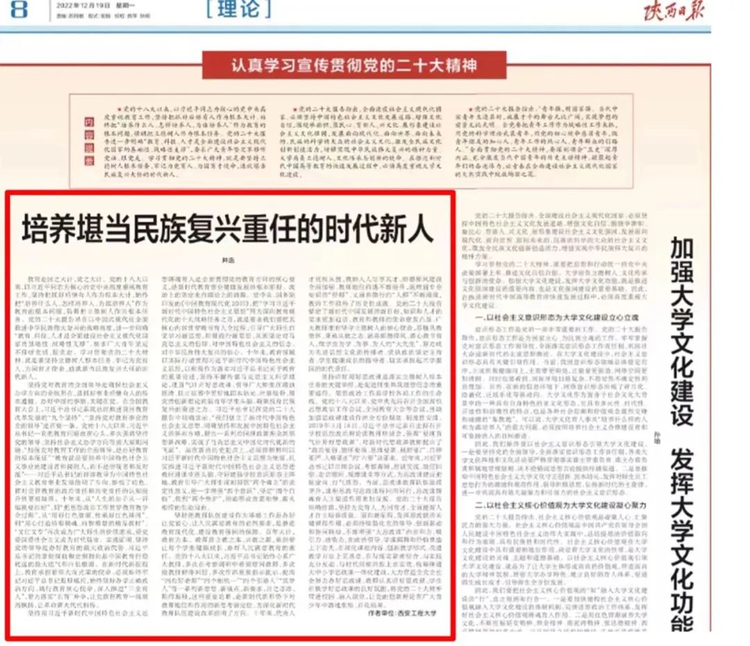 深入学习宣传贯彻党的二十大精神,党建工作取得新成效。学校党委围绕宣讲巡讲、研究阐释、贯彻落实等方面制定学习宣传贯彻党的二十大实施方案,开展系列主题教育活动,书记、校长带头宣讲党的二十大精神,十余位校内校外专家学者、党的二十大代表等在线上线下广泛宣讲,在主流媒体积极发声,全校掀起深入学习宣传贯彻党的二十大精神热潮。扎实做好巡视整改暨教育领域突出问题专项整治,开展作风建设专项行动和清廉学校建设。领导干部建言资政作用进一步凸显,马万清同志当选省政协第十三届委员会常务委员,王海燕同志为西安市十五届政协委员,邓咏梅同志为省十三届政协委员,夏蔡娟同志为省十四次党代会代表。2个党支部获批教育部第三批“全国样板党支部”,1个学院党委获批省委教育工委第三批“全省标杆院系”。选优配强干部队伍,全校共调整提任处级干部132人。学校连续五年获“双百工程”先进单位,获省级参扶单位驻村联户扶贫工作优秀单位。