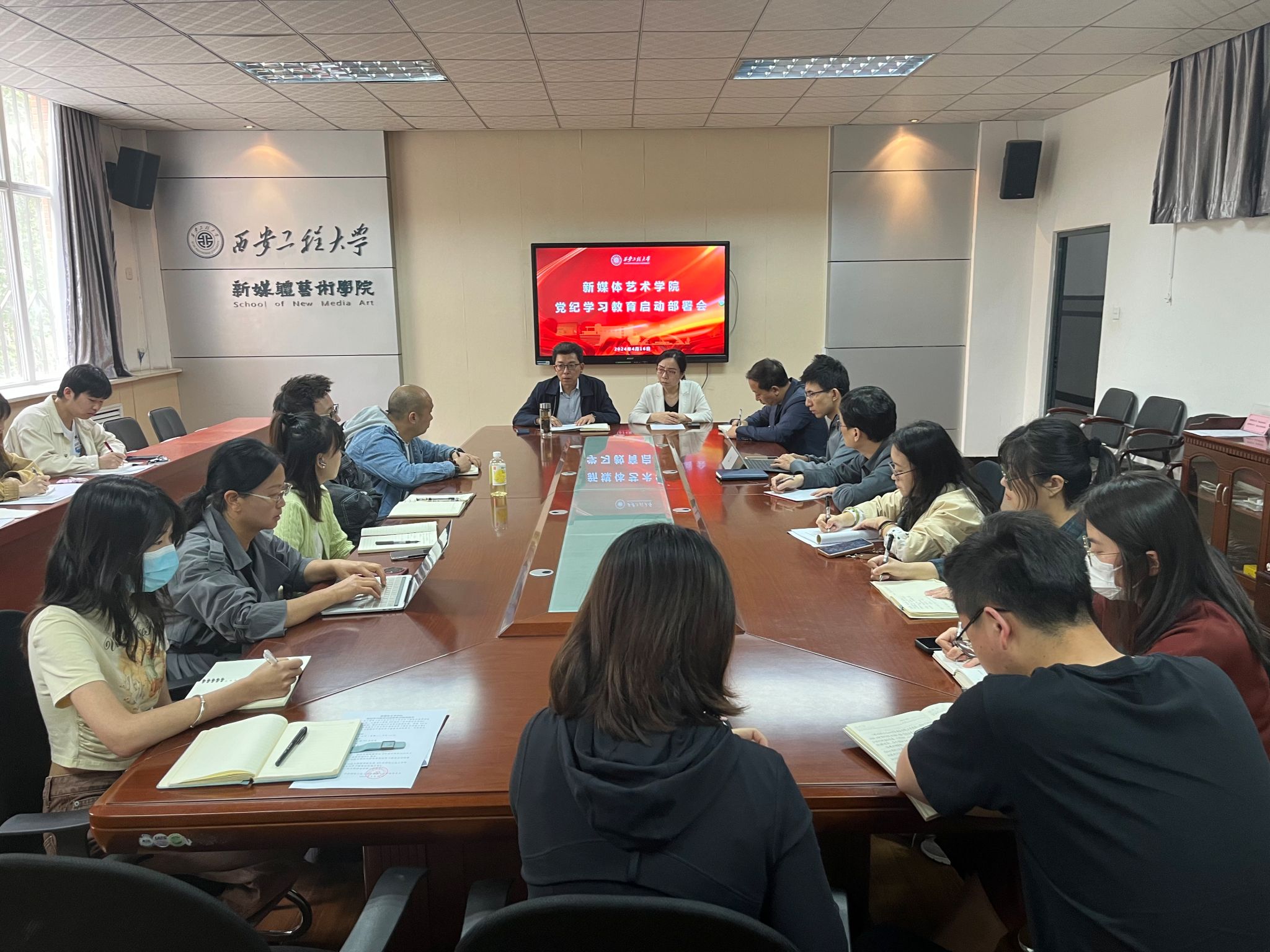 4月16日下午,新媒体艺术学院召开党纪学习教育启动部署会。院党委班子成员,各支部书记、副书记、支部委员参加会议。会议由院党委副书记赵文熙主持。
