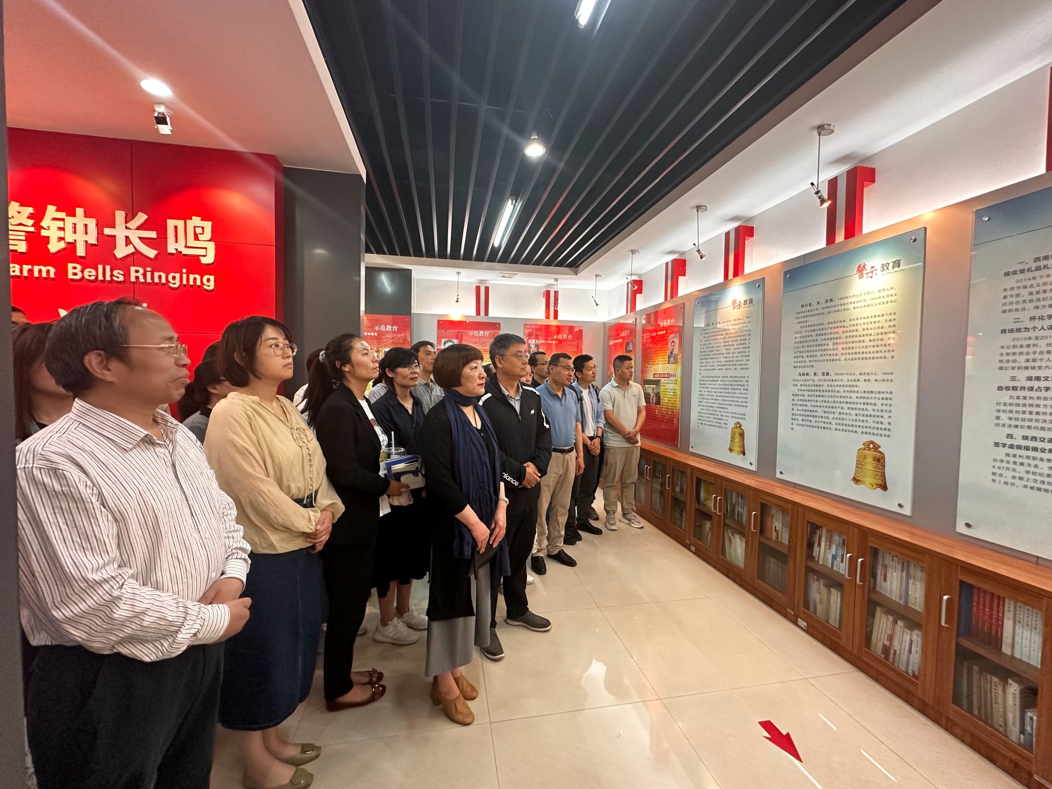 在校廉政教育基地,映入眼帘的“反腐倡廉,警钟长鸣”几个大字让人不禁肃穆。跟随讲解员生动的讲解,全体党员依次参观学习了党和国家领导人反腐倡廉寄语、反腐倡廉历程、廉政准则教育、示范教育、警示教育和廉政文化教育等六大板块的内容。在警示教育板块前,学院班子成员分别领学近年来教育系统违法犯罪典型案件,以案为鉴,提醒党员教师要时刻加强党性修养,始终保持清醒头脑和高度警觉,防微杜渐,严守纪律,强化学习,务实干事,牢记全心全意为人民服务的宗旨,筑牢拒腐防变的思想防线。