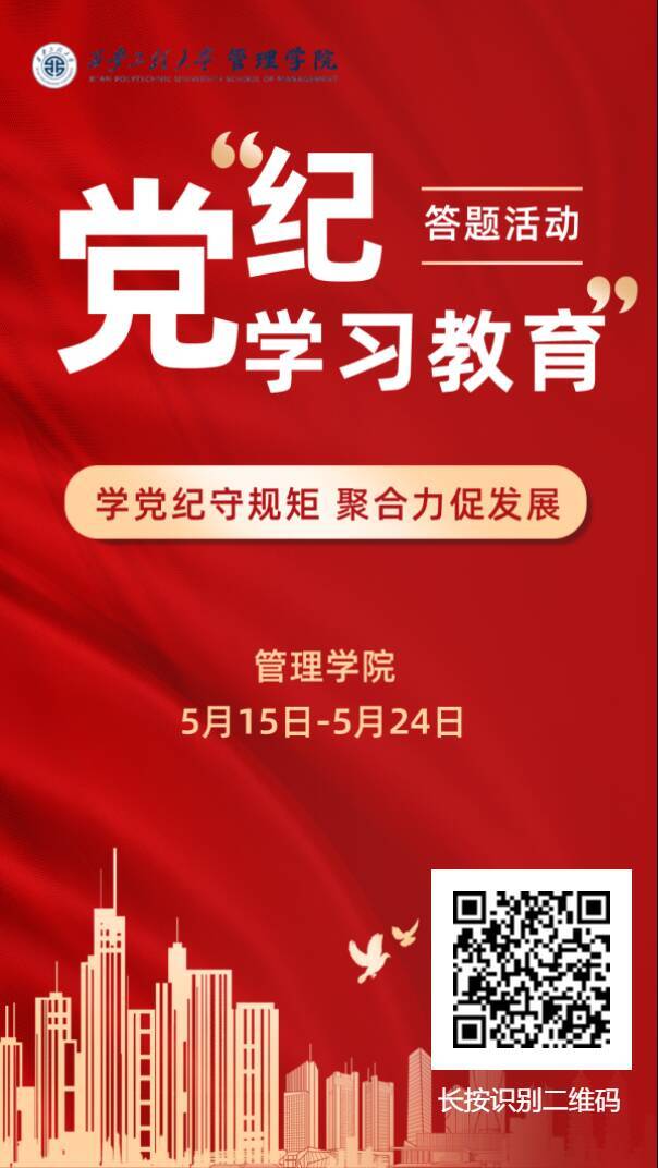 为推动党纪学习教育走深走实,引导学院师生认真学习、深入掌握党纪知识,培养纪律意识、弘扬廉洁文化,营造全员参与、人人学纪的浓厚氛围,切实增强党纪学习教育成效,5月15日至24日,管理学院组织全院师生党员围绕“学纪、知纪、明纪、守纪”开展党纪学习教育答题活动。