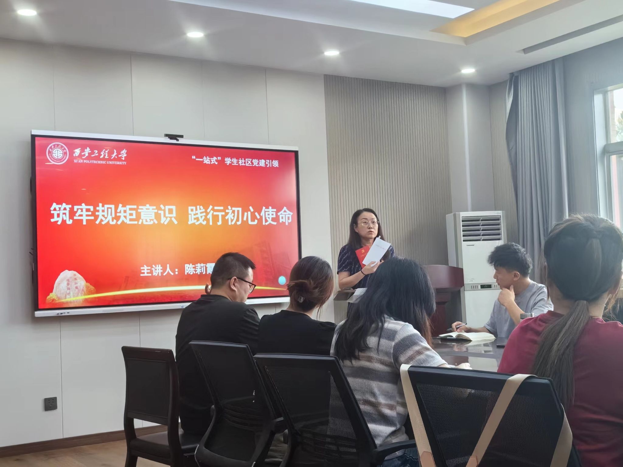 紧接着,陈莉霞为全体党员上了一堂生动的纪律党课——《筑牢规矩意识践行初心使命》。党课中,陈莉霞深入浅出地阐述了全面从严治党、加强党的纪律建设的重要性,通过生动的案例分析和深刻的理论阐述,强调了党员干部要不断加强自我修养,提高政治觉悟,始终坚守初心使命,严明纪律规矩,做到心有所畏、言有所戒、行有所止,号召全体党员要筑牢规矩意识,践行初心使命,下足功夫,真正做到学纪知纪入脑入心,明纪守纪见行见效。