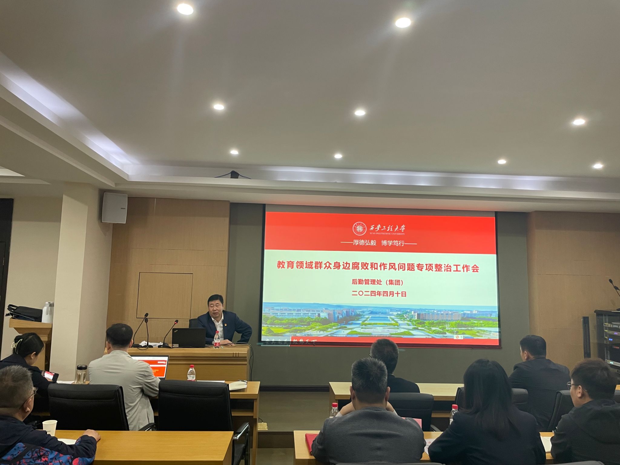 4月10日上午,后勤管理处(集团)在临潼校区行政楼321会议室召开教育领域群众身边腐败和作风问题专项整治工作会,进一步推动后勤领域集中整治,凝聚工作合力,营造风清气正的服务保障环境。校党委副书记殷永建出席并讲话,后勤管理处(集团)党政领导班子成员,后勤所属各科室(中心)负责人,餐饮、物业等13家驻校第三方服务企业负责人等20余人参加会议。会议由后勤管理处(集团)党总支书记杨森主持。