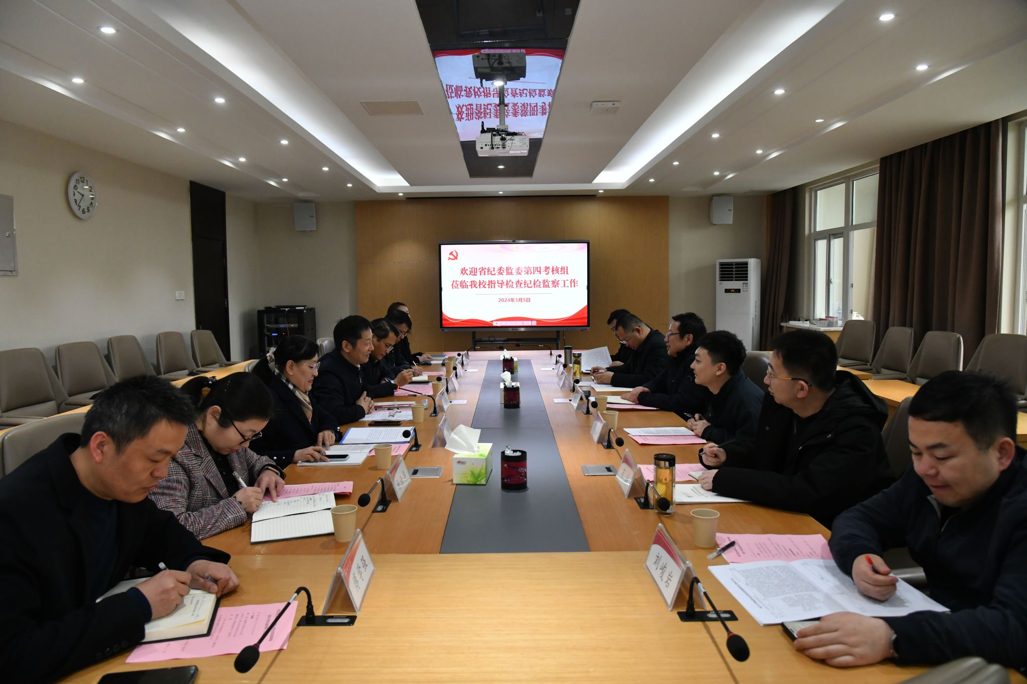 会上,辛永昌代表学校对考核组一行入校指导和检查工作表示热烈欢迎和衷心感谢,他首先介绍了学校基本情况,从2023年度工作亮点、工作开展情况、存在不足及今后打算等四个方面进行了纪检监察工作汇报,并从强化政治监督,确保党的二十大精神落实落地;强化“四风”纠治,促进解决师生关切问题;强化纪律约束,持续增强正风肃纪反腐;强化纪律教育,持续推进清廉学校建设;强化教育整顿,持续锤炼纪检监察铁军等五项内容介绍了校纪检监察机构年度重点工作。牟建霖组长代表考核组对学校2023年纪检监察工作表示肯定,传达了陕西省纪委副书记王晓江在2023年度高校纪检监察机构述职会议上的讲话精神,并对本次考核工作提出了思想上要高度重视、行动上要积极配合、严格遵守考核纪律等三点要求。