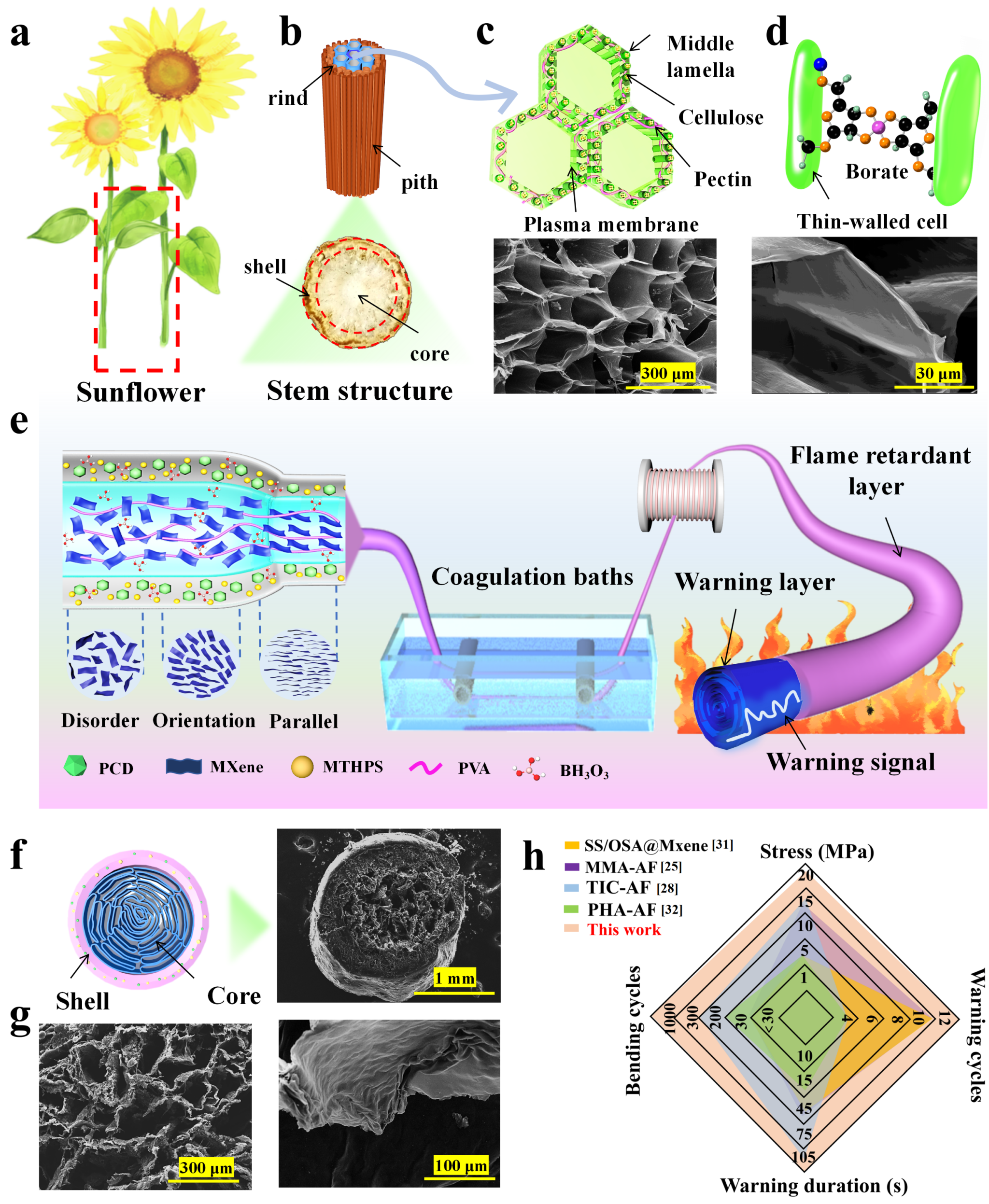 该研究受自然界向日葵茎秆“刚柔并济”的多级结构启发,创新性地设计并制备出一种具有同轴结构的智能火灾预警纤维。该纤维以PVA/MXene复合材料为传感芯层(模拟茎秆“髓部”),外层包覆功能性阻燃保护鞘层(模拟“皮层”),通过硼酸交联构建稳定界面,成功实现了高温下的快速电阻响应与持久阻燃防护。