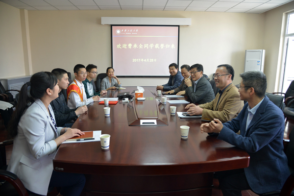4月28日上午,校党委书记刘江南、纪委书记朱君强在临潼校区接见了刚刚从第十三届全国见义勇为英雄模范表彰大会上载誉归来的曹承全同学。见证了曹承全成长的他所在班级的同学代表、辅导员,校相关单位负责人参加了会见和座谈。
