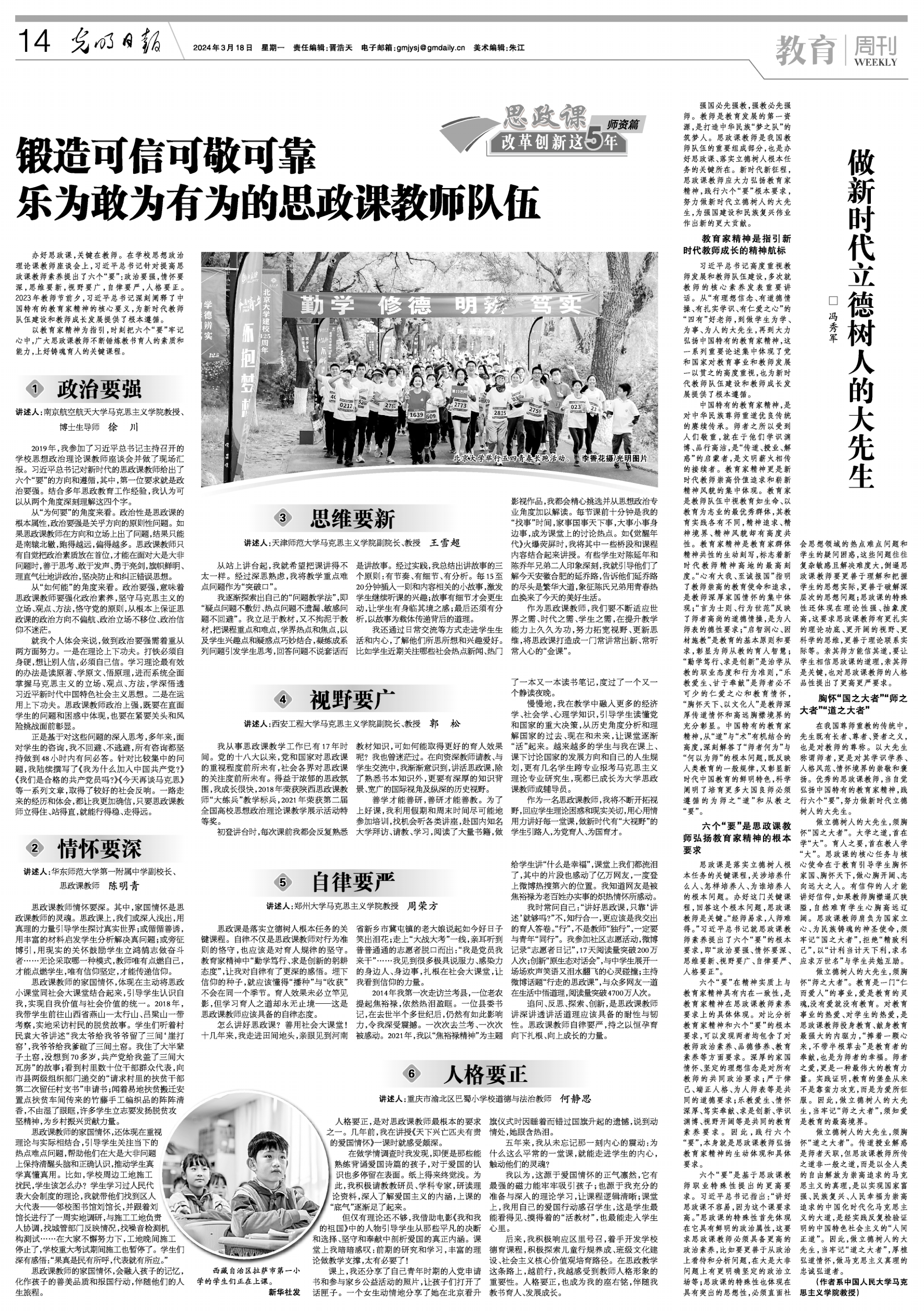 3月18日,《光明日报》14版教育周刊刊发best365官网马克思主义学院教师郭松题为《视野要广》的教学体会文章。2019年3月18日,习近平总书记主持召开学校思想政治理论课教师座谈会,并发表重要讲话,针对提高思政课教师素养提出了六个“要”:政治要强,情怀要深,思维要新,视野要广,自律要严,人格要正。《光明日报》在《思政课改革创新这5年——师资篇》中,邀请全国六位大中小学思政课教师围绕“锻造可信可敬可靠乐为敢为有为的思政...