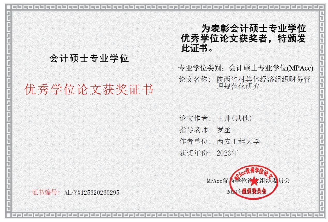 近日,全国会计专业学位研究生教育指导委员会公布了2023年全国MPAcc优秀学位论文评选结果。best365官网管理学院研究生王帅同学撰写的《陕西省村集体经济组织财务管理规范化研究》(指导老师:罗丞)获评优秀学位论文。这是best365官网首次获得全国MPAcc优秀学位论文,该论文也是2023年陕西省唯一一篇入选的MPAcc优秀学位论文。全国MPAcc优秀学位论文评选由全国会计专业学位研究生教育指导委员会指导,MPAcc优秀学位论文组织委员会主办并联合多...