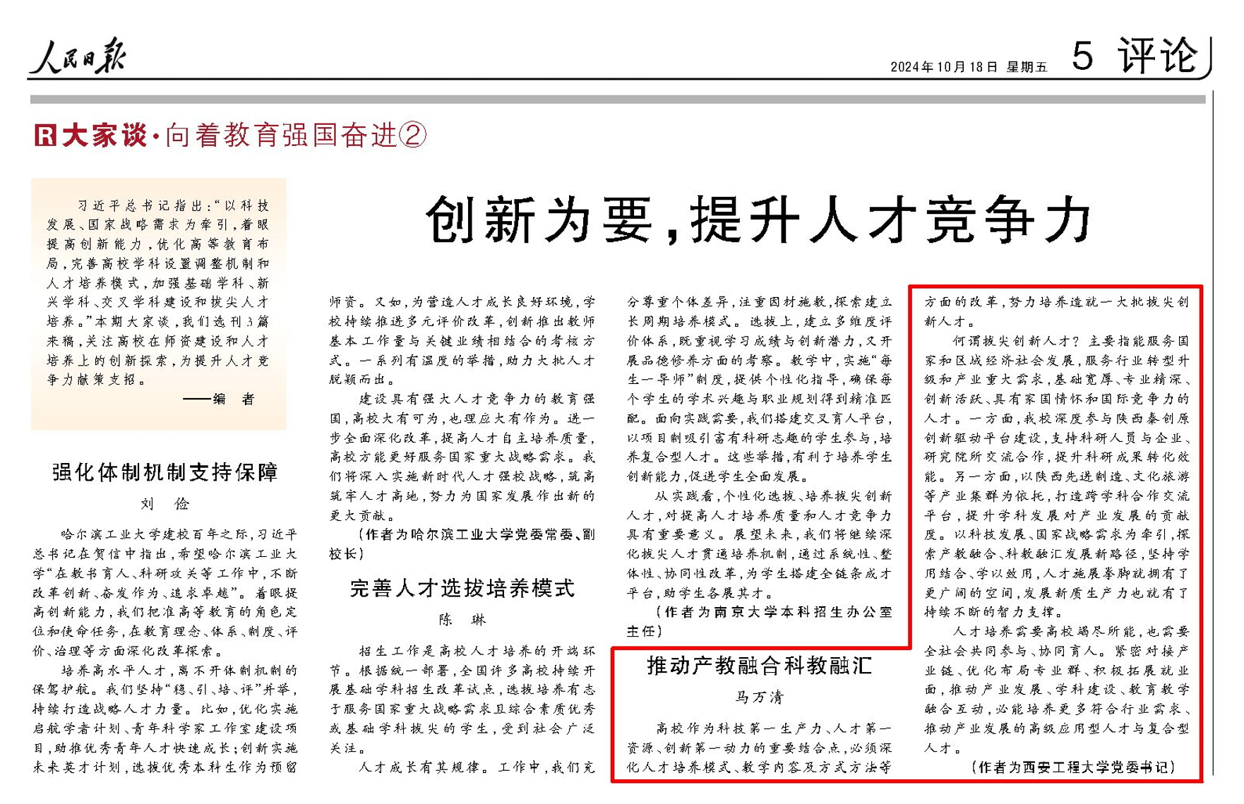 10月18日,《人民日报》第五版“大家谈·向着教育强国奋进”专栏刊发best365官网党委书记马万清署名文章《推动产教融合科教融汇》。文章围绕“提升人才竞争力”主题,介绍了best365官网在培养拔尖创新人才方面的创新探索,为行业特色高校培养更多符合行业需求、推动产业发展的高级应用型人才与复合型人才提供了经验和借鉴。推动产教融合科教融汇马万清高校作为科技第一生产力、人才第一资源、创新第一动力的重要结合点,必须深化人才培养模式、...