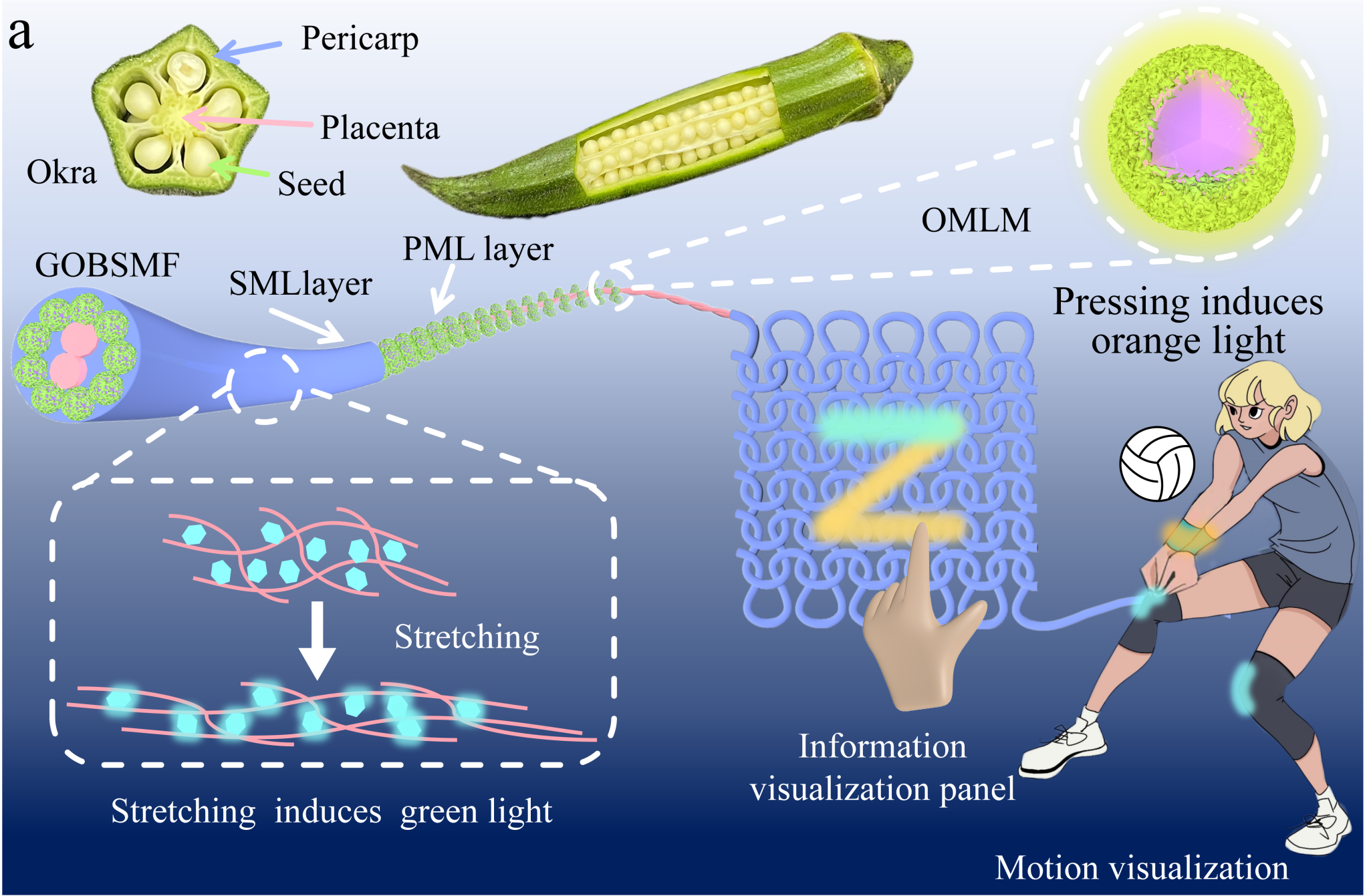 近日,best365官网功能性纺织材料及制品教育部重点实验室樊威教授团队在材料领域顶刊Advanced Materials发表题为“用于视觉信号传输的仿秋葵结构绿-橙双色切换力致发光纤维”(Green-Orange Bi-color Switchable Mechanoluminescent Fiber of Okra-Like Structure for Visual Signaling)的研究论文。该研究受自然界中秋葵独特的多层结构启发,巧妙地模仿了秋葵的“胎座”“子房室”“种子”和“果皮”结构:以弹性PDMS纱线为柔性支撑...