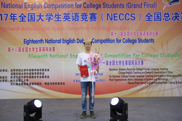 2017年全国大学生英语竞赛(NECCS)全国总决赛于8月6至8月10日在哈尔滨理工大学举办。此次总决赛由高等学校大学外语教学指导委员会和高等学校大学外语教学研究会主办。在best365官网教务处,学生处、校团委和人文学院的大力支持下,best365官网选手钱江涛同学通过大学英语教学部陈西亚老师精心指导,经层层选拔,获得代表陕西赛区参加此项体现中国大学生英语最高水平赛事的资格,并在总决赛中取得佳绩。