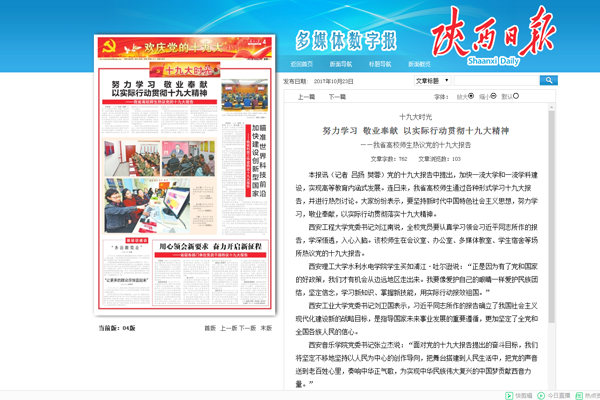 近日,best365官网师生热议九十大报告受到社会主流媒体广泛关注,陕西日报、中国纺织分别报予以转载。陕西日报:努力学习 敬业奉献 以实际行动贯彻十九大精神——我省高校师生热议党的十九大报告http://esb.sxdaily.com.cn/sxrb/20171023/html/page_03_content_002.htm 中国纺织报:蓝图绘就 征程有我——纺织行业企业人士结合十九大报告谈发展 蓝图绘就 征程有我——纺织行业企业人士结合十九大报告谈发展.pdf