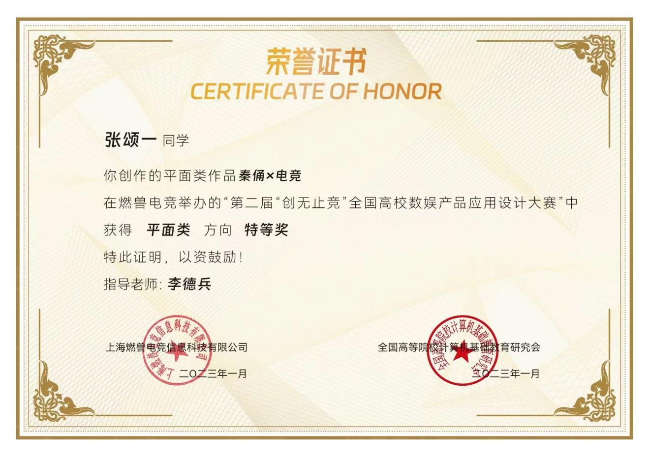 日前,由全国高等院校计算机基础教育研究会指导、上海燃兽电竞信息科技有限公司主办的第二届“创无止竞”全国高校数娱产品应用设计大赛结果揭晓,best365官网新媒体艺术学院动画专业2019级(2)班学生张颂一创作《秦俑×电竞》作品,在平面类赛道荣获特等奖的好成绩,新媒体艺术学院教师李德兵被评为优秀指导教师。