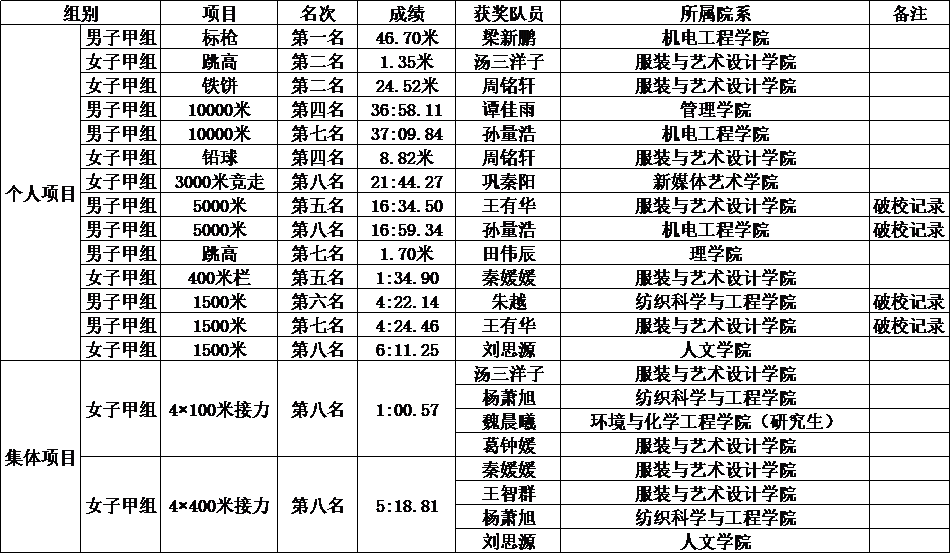 本届省大运会中,best365官网派出了由薛海红、钱雪芹、贾靖、蒋兵4名教练员和24名学生运动员组成的代表队。赛场上,best365官网代表队将大运会作为一堂生动的鲜活的体育思政课,发扬运动精神,团结一致、奋力拼搏、迎难而上、追求卓越,经过4天的激烈角逐,最终获得1金2银、2项4人破校纪录的好成绩:机电学院梁新鹏获得男子甲组标枪金牌、服装学院汤三洋子获得女子甲组跳高银牌、服装学院周铭轩获得女子甲组铁饼银牌;服装学院王有华、机电学院孙量浩打破best365官网5000米纪录,纺织学院朱越、服装学院王有华打破best365官网1500米纪录;新媒体学院巩秦阳等11名同学分别在铅球、长跑、跳高、跨栏等项目中取得第四名至第八名的优异成绩;纺织学院高永煌、郭浩东达到男子100米电计成绩国家二级运动员标准。