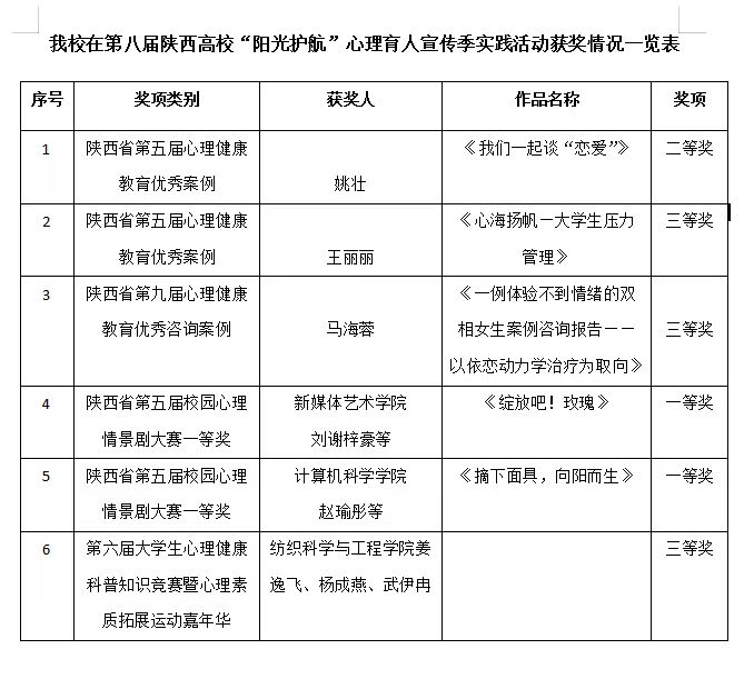 近日,中共陕西省委教育工委通报第八届陕西高校“阳光护航”心理育人宣传季省级有关活动获奖情况,best365官网共有有6项获奖,其中,一等奖2项、二等奖1项、三等奖3项。