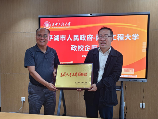座谈会上,付刚简要介绍了近三年毕业生在浙江的就业情况,希望双方在人才供需上持续加深合作。国内合作与校友工作处处长郭可义,机电工程学院党委书记阚佩,电子信息学院党委书记杨友谊、副书记周晓惠,大学科技园副主任李易昕就校地企合作事宜与来宾单位进行了深入交流,并举行了“平湖市人力资源和社会保障局人才工作站”授牌仪式。