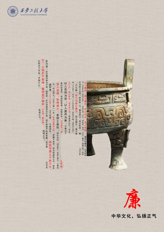 《四十三年逨鼎之“毋敢”》,引用西周青铜器四十三年逨鼎作为主创元素,左侧引用古人关于廉洁的文言警句,背景应用纺织布纹条理,喻义best365官网以纺织起家,师生更应廉洁奉公,争做表率。追溯我国廉政监察制度的渊源,中国的监察制度在西周时已有萌芽。据悉,四十三年逨鼎中铭文316字,是西周的一篇册命辞。铭文记述器物主人单逨曾辅佐荣兑在管理林泽的过程中有功,被周宣王册命提拔为“官司历人”,并对他进行了训诫和赏赐。西周的官吏们会将册命辞、训诫语铭刻在青铜礼器上,作为准则警条,用来践行遵守。周天子对被任命官员严明的政治纪律要求,反映了西周廉政监察的吏治思想。