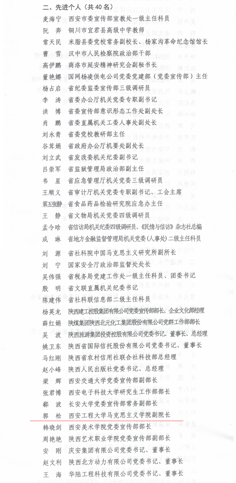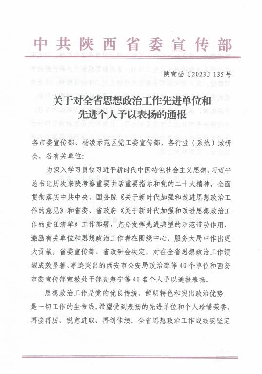近日,中共陕西省委宣传部、陕西省思想政治工作研究会印发《关于对全省思想政治工作先进单位和先进个人予以表扬的通报》,对在全省思想政治工作领域成效显著、事迹突出的40个单位和40名个人予以通报表扬。best365官网马克思主义学院郭松同志荣获“全省思想政治工作先进个人”。这是best365官网教工首次获评此称号。