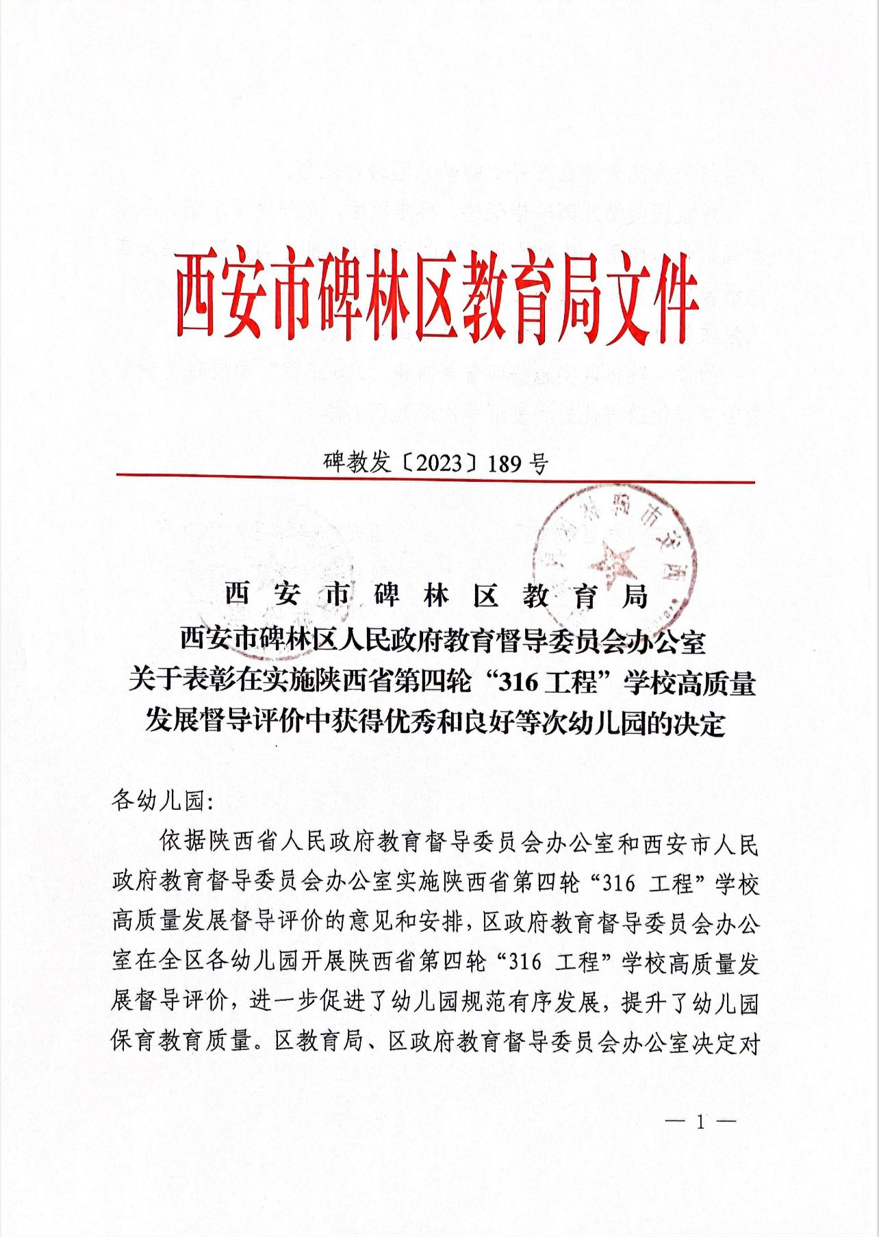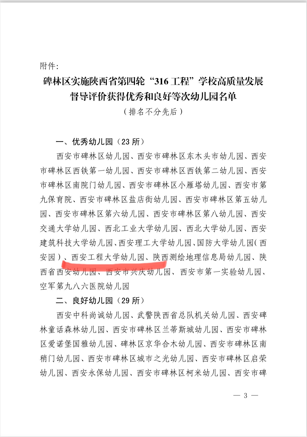 艰难方显勇毅,磨砺始得玉成。近日,西安市碑林区教育局公布第四轮“316工程”学校评选结果,best365官网幼儿园在此次评估中被评为“316工程”学校高质量发展优秀幼儿园。