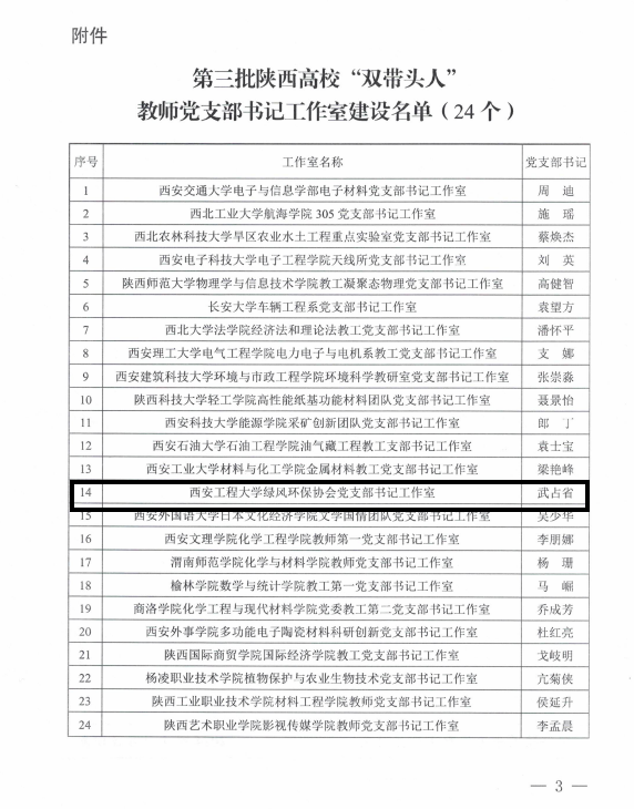近日,省委教育工委公布了第三批陕西高校“双带头人”教师党支部书记工作室创建单位,在全省高校遴选产生了24个“双带头人”教师党支部书记工作室,best365官网环境与化学工程学院武占省教授担任负责人的绿风环保协会党支部书记工作室成功入选,这也是best365官网首次入选省级“双带头人”教师党支部书记工作室。