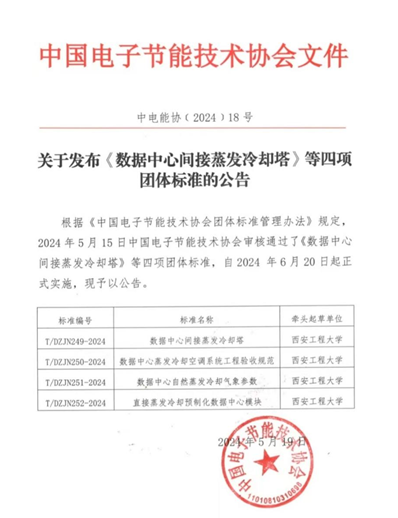 《数据中心间接蒸发冷却塔》(T/DZJN 249-2024)规定了数据中心间接蒸发冷却塔的术语和定义、型式与基本参数、技术要求、试验方法、检验规则以及标志、包装、运输、贮存等。适用于具有空气预处理模块,利用蒸发冷却原理,以水、空气为介质,能根据数据中心需求产出相应水温、为液冷工作介质降温或供冷凝器散热的复合式间接蒸发冷却塔,以其他液体作为介质的间接蒸发冷却塔的制造也可参照。《数据中心蒸发冷却空调系统工程验收规范》(T/DZJN 250-2024)适用于数据中心新建及改扩建工程,包括蒸发冷却冷风系统与蒸发冷却冷水系统等正式投入使用前的施工验收工作。《数据中心自然蒸发冷却气象参数》(T/DZJN 251-2024)规定了数据中心自然/蒸发冷却空调系统与设备节能设计计算用气象参数,各类数据中心风侧、水侧及制冷剂侧蒸发冷却空调系统和自然冷却系统,所提供的气象参数适用于自然/蒸发冷却空调的设计计算与设备选型。《直接蒸发冷却预制化数据中心模块》规定了直接蒸发冷却预制化数据中心模块的运行模式、安装方式及气流组织、技术要求、试验方法、检测规则、标志、包装、运输和贮存等,适用于能够与数据中心直接对接的全新风直接蒸发冷却预制化模块产品。