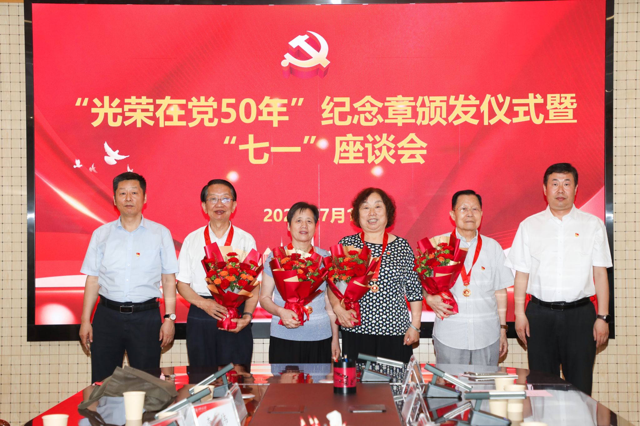 7月1日下午,best365官网在金花校区第三会议室举办“光荣在党50年”纪念章颁发仪式暨“七一”座谈会。校党委副书记、纪委书记、监察专员辛永昌,党委副书记殷永建出席会议并讲话。会议由校党委委员、组织部部长黄海峙主持,党委相关职能部门负责人、部分院(部)级党组织书记、“光荣在党50年”老党员、师生党员代表参加会议。