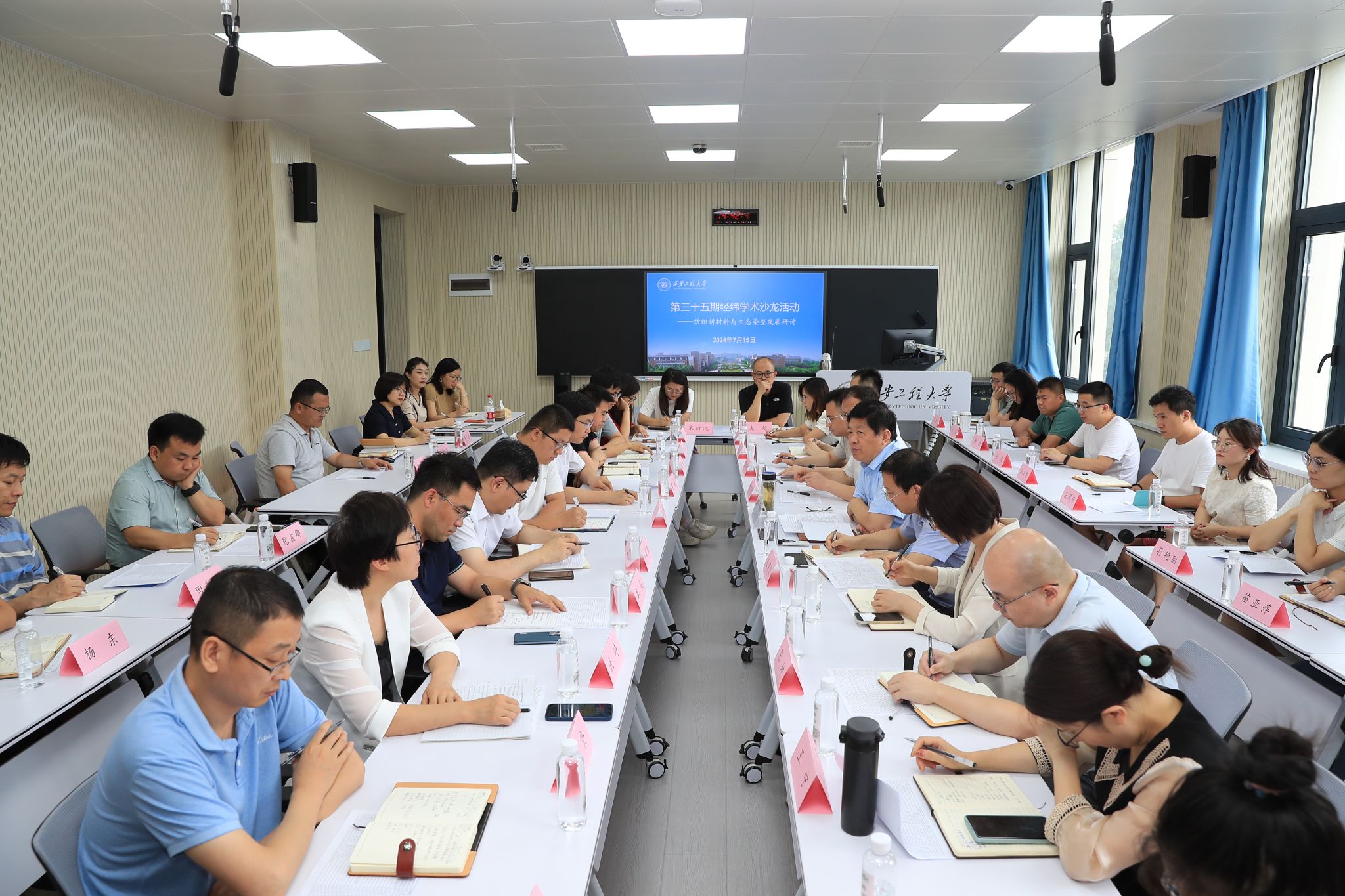 7月15日下午,best365官网举办以“纺织新材料与生态染整发展”为主题的经纬学术沙龙活动,校长王海燕出席此次学术沙龙活动并与青年教师深度交流。人事处、科技研究院、研究生院(学科办)等相关职能部门负责人、纺织学院、环化学院、材料学院等相关学科44位青年教师代表参加此次学术沙龙活动,活动由人事处处长王晓先主持。