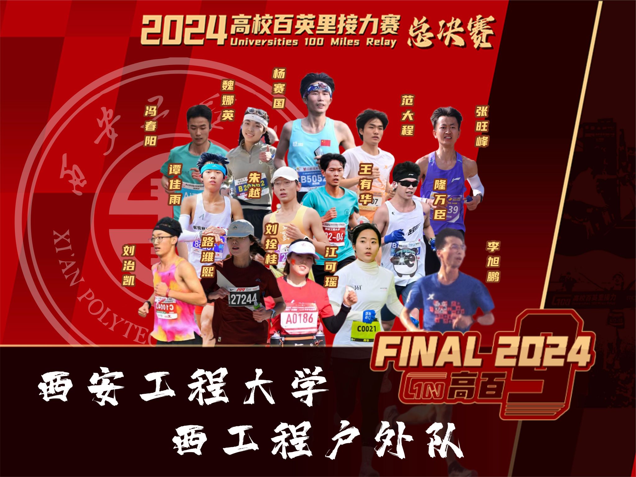 校友路潍熙、冯春阳,与谭佳雨等12名在校生组成了参赛队伍,他们在赛场上喊出了“薪火相传,砥砺奋进,工程户外,共创辉煌”的坚定口号,以无畏的勇气和坚韧的毅力,用时9小时37分04秒跑完了全程160公里并取得了优异成绩;现场还有9位校友不远千里前往赛场为参赛队员们提供后勤保障服务,充分展现出西工程大人的凝聚力和爱校荣校情怀。