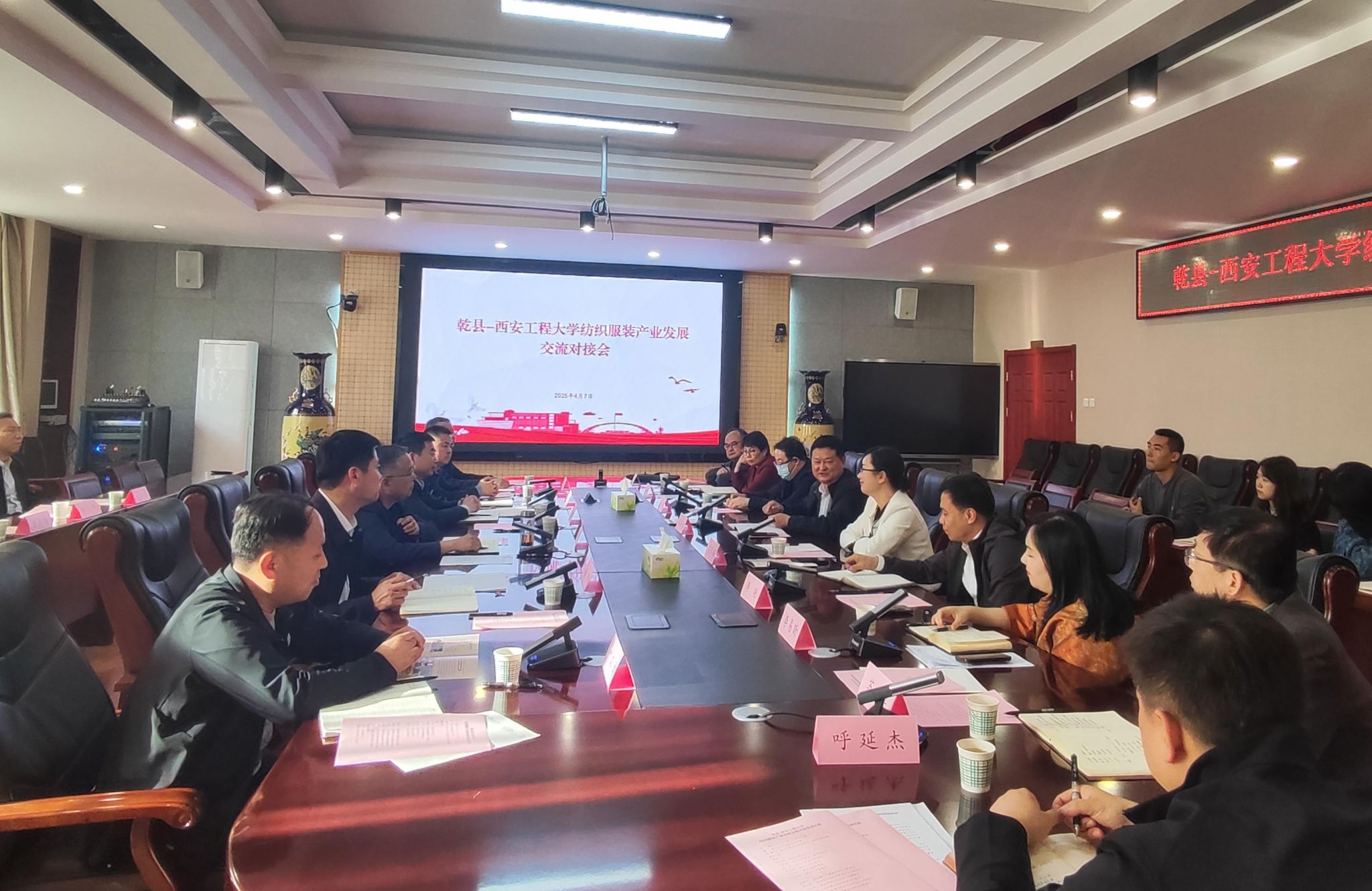 4月7日下午,乾县县委书记闫兴斌,县委常委、政法委书记余胜辉,副县长南伟,县工信局、文化和旅游局及纺织企业负责人等一行莅临best365官网开展纺织服装产业发展对接工作。校党委书记马万清出席座谈会,服装与艺术设计学院、纺织科学与工程学院、新媒体艺术学院、大学科技园等单位负责人参加座谈会,会议由副校长夏蔡娟主持。