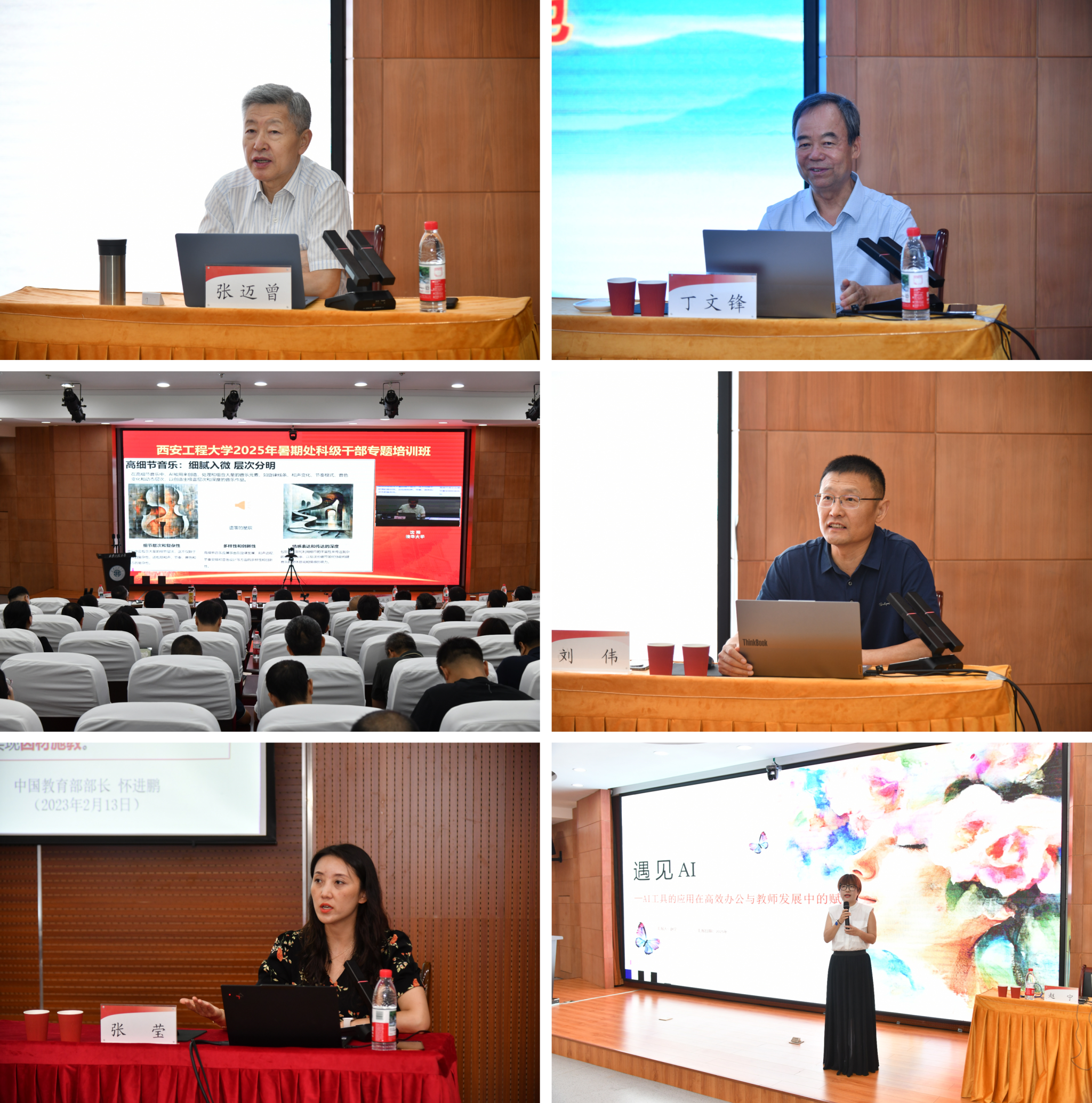 专题教学中,陕西省人大常委会原副主任、西安交通大学原党委书记张迈曾,中央党校教授、国家行政学院教务部原主任丁文锋,清华大学新闻学院、人工智能学院双聘教授沈阳,北京邮电大学人机交互与认知工程实验室主任刘伟教授,西北工业大学数学与统计学院党委副书记张莹教授,西北AIGC产业创新中心主任、西安邮电大学教师赵宁分别以“大学的内涵发展与质量建设”“统筹推进教育科技人才体制机制一体改革的重大意义、科学内涵和路径措施”“生成式人工智能发展与产业应用”“人工智能未来发展趋势:人机环境系统智能”“‘数智+创新’教育背景下的课程建设与教学设计”“人工智能时代的学术共同体:DeepSeek+在高效办公与教师发展中的应用”为题,为全体参训学员作了精彩讲授;科技研究院负责人为各教学单位解读了学校新出台的科研制度文件。