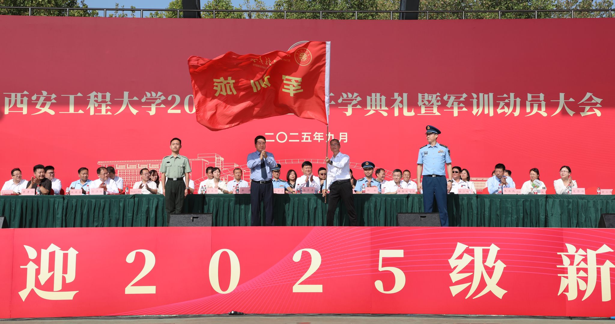 军训动员环节,校党委副书记井浩为2025级新生军训承训团授旗,2025级本科新生即将开始为期14天的新生军训,通过军事训练、军事管理、军事教育锤炼意志、塑造品格。