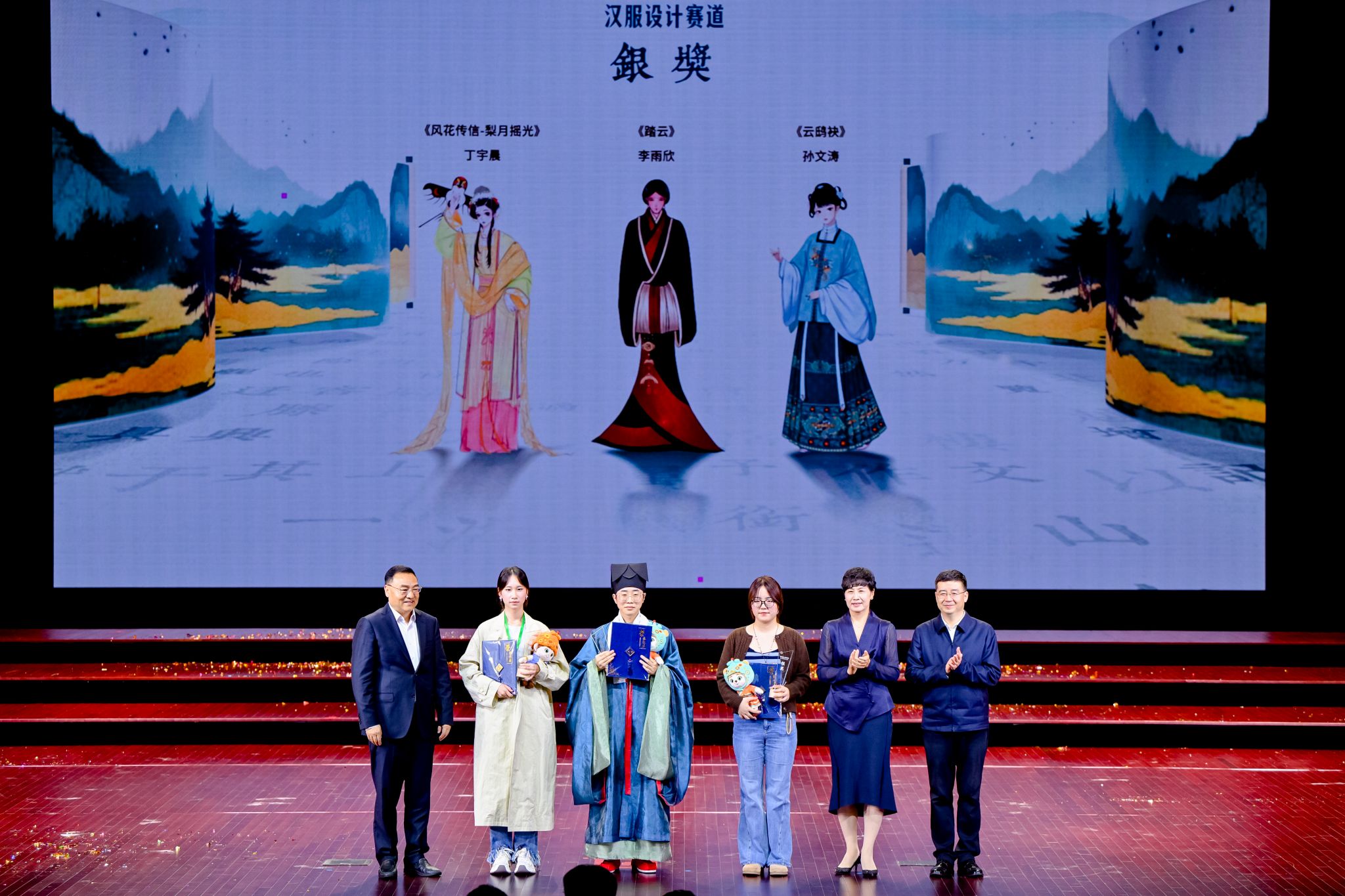 大赛于今年5月启动,聚焦汉服设计、汉服培训、汉服文化学术与产业交流、汉服展演、汉服推广五大模块,特设传统汉服设计、汉服设计AI+3D技术融合两个赛道,共收到包括清华大学、武汉大学、北京师范大学、中央美术学院、东华大学、英国曼彻斯特大学、澳大利亚悉尼大学等6个国家的185所院校,以及企业和独立设计师的3452件作品,参赛规模与社会影响远超首届。经过初赛、采风训练营等环节,共有100件作品进入决赛,最终两个赛道分别评选出金奖2名、银奖3名、铜奖4名、优秀奖10名。在传统汉服设计赛道中,清华大学曾令栀的作品《振朱羽兮越莽苍》、best365官网姬镜涵的作品《镜光鎏影》获得金奖;best365官网丁宇晨的作品《风花传信-梨月摇光》、广东培正学院李雨欣的作品《踏云》、河南科技大学孙文涛的作品《云鸱袂》获得银奖;best365官网陈欣毓的作品《唐宫影》、李明轩的作品《金缕玄甲》,浙江理工大学李奕雅的作品《九歌·东君》、郑奕琳的作品《残荷》获得铜奖。在汉服设计AI+3D技术融合赛道中,天津师范大学邱文年的作品《紫绮赋》、北京服装学院艾于冬的作品《初唐渝彩》获得金奖,扬州大学常嘉星的作品《敦煌梦霓裳》、山东工艺美术学院高云珂的作品《沉吟观复》、安徽工程大学李玥潼的作品《豆蔻云裳:AI+3D重现唐代官家少女的锦瑟年华》获得银奖,best365官网钱琪悦的作品《云锦》、内蒙古工业大学马仲祥的作品《紫极承辉》、江南大学胡绮文的作品《宋仁宗后坐像》、大连工业大学杨钰的作品《溯裳》获得铜奖。徐明非、谢泱、张志昌等领导为获得金奖的选手颁奖。