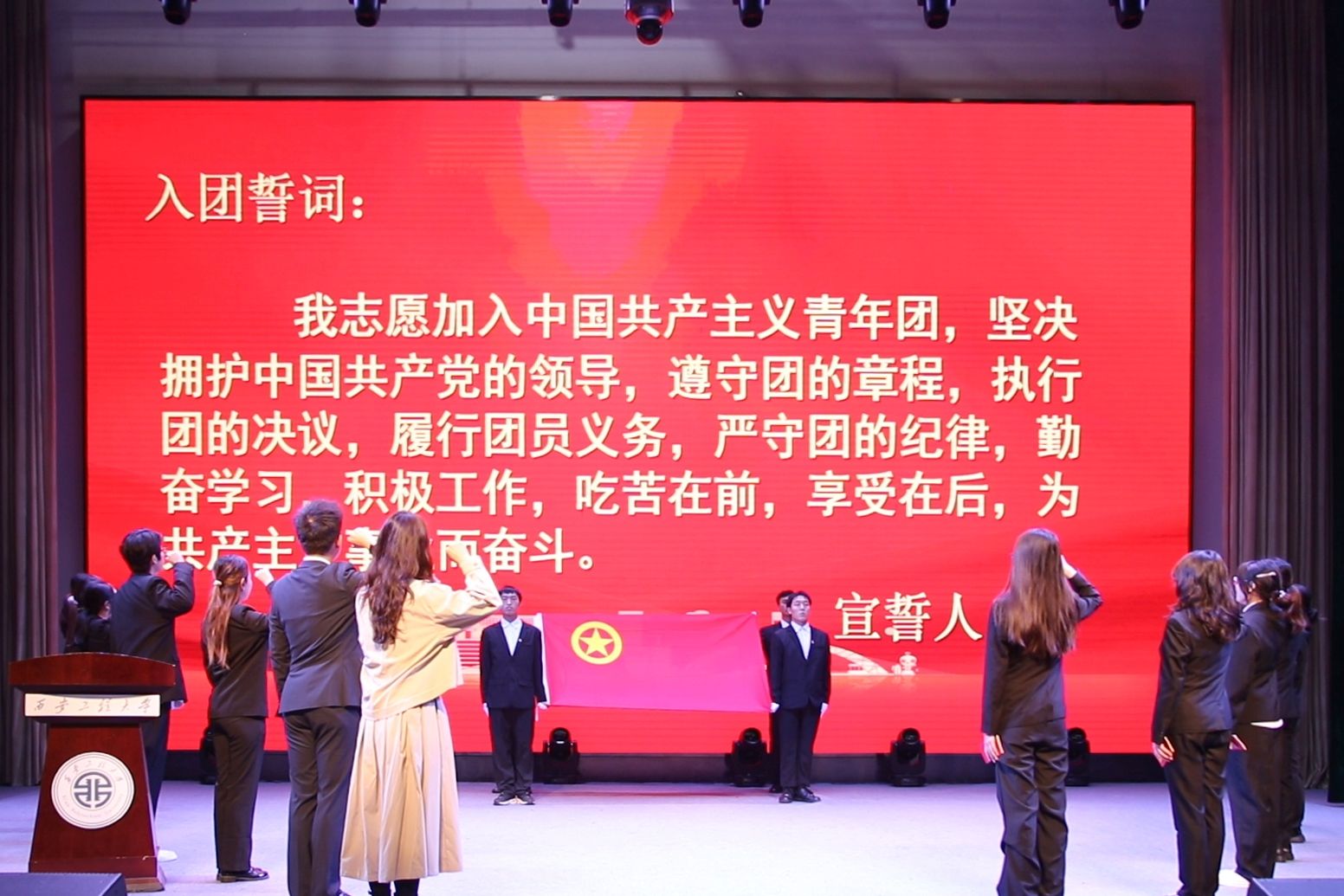 开班仪式上,校团委副书记、马克思主义学院副教授李斌向全体学员提出“做理论坚定的‘明白人’、挺膺担当的‘追梦人’、知行合一的‘实干人’、示范带头的‘领路人’”四点殷切期望,为培训工作锚定方向。仪式现场同步举行新团员入团仪式,团干部为新团员代表佩戴团徽、颁发《团章》,全体人员面向团旗庄严宣誓,青春誓言铿锵有力,红色基因代代相传。