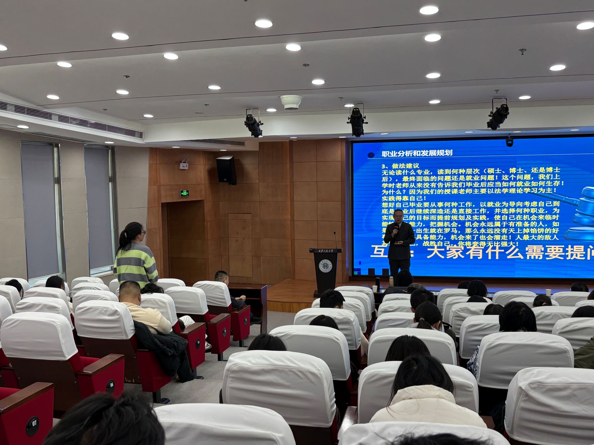 活动中,徐新逸律师以“我的法律逐光之路”为主题,结合自己16年的法律执业经历,详细解析了公务员、专职律师、企业法务、高校教师等多元职业路径的能力要求与成长路径;程铖从金融跨界视角出发,分享了法律与金融财富管理领域的融合机遇,为学子们拓宽了职业认知视野。方韶莉以“法律,你未来路上隐形的铠甲”为主题,围绕职业规划制定、核心能力提升等关键内容,系统梳理职业发展重点方向。